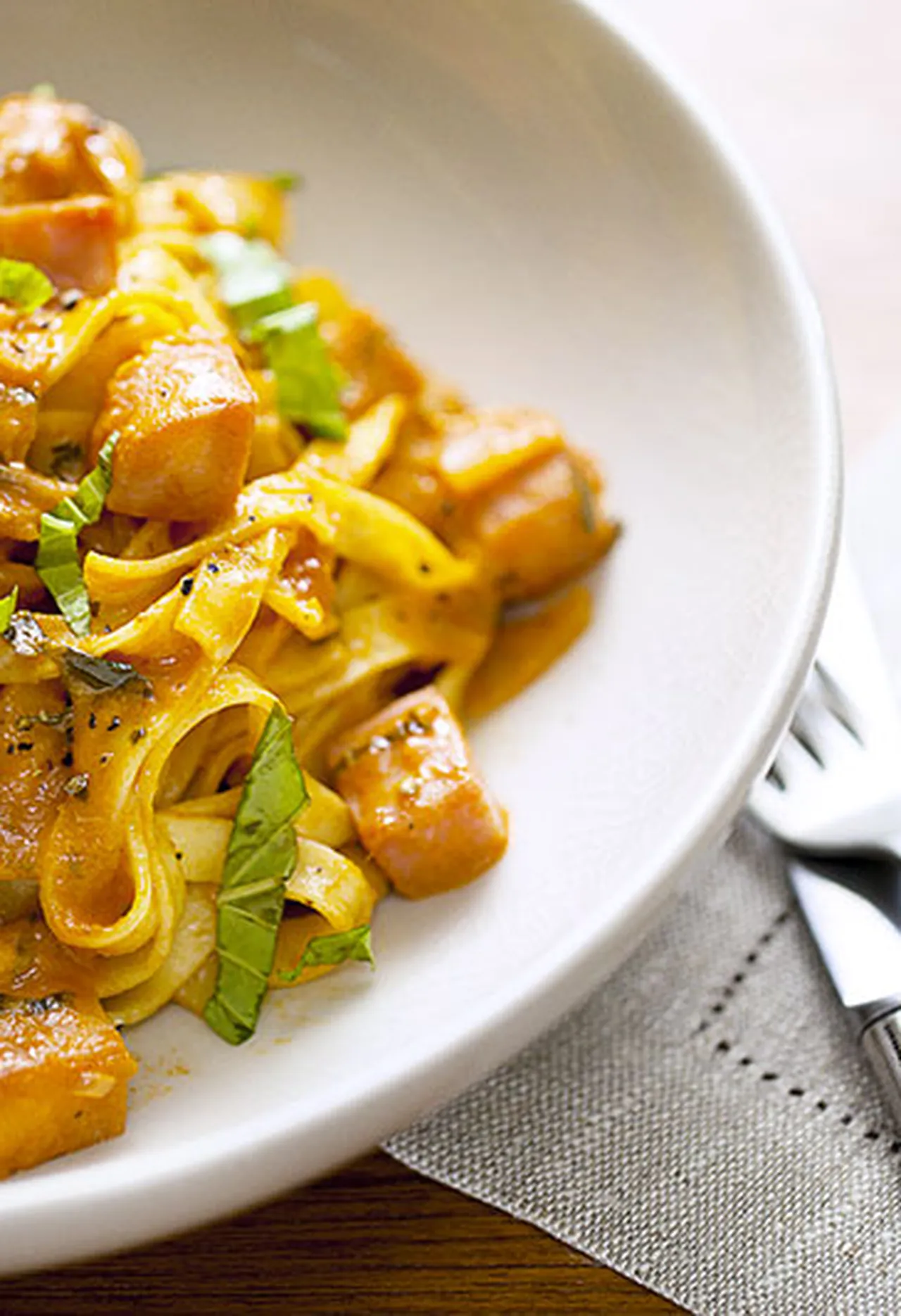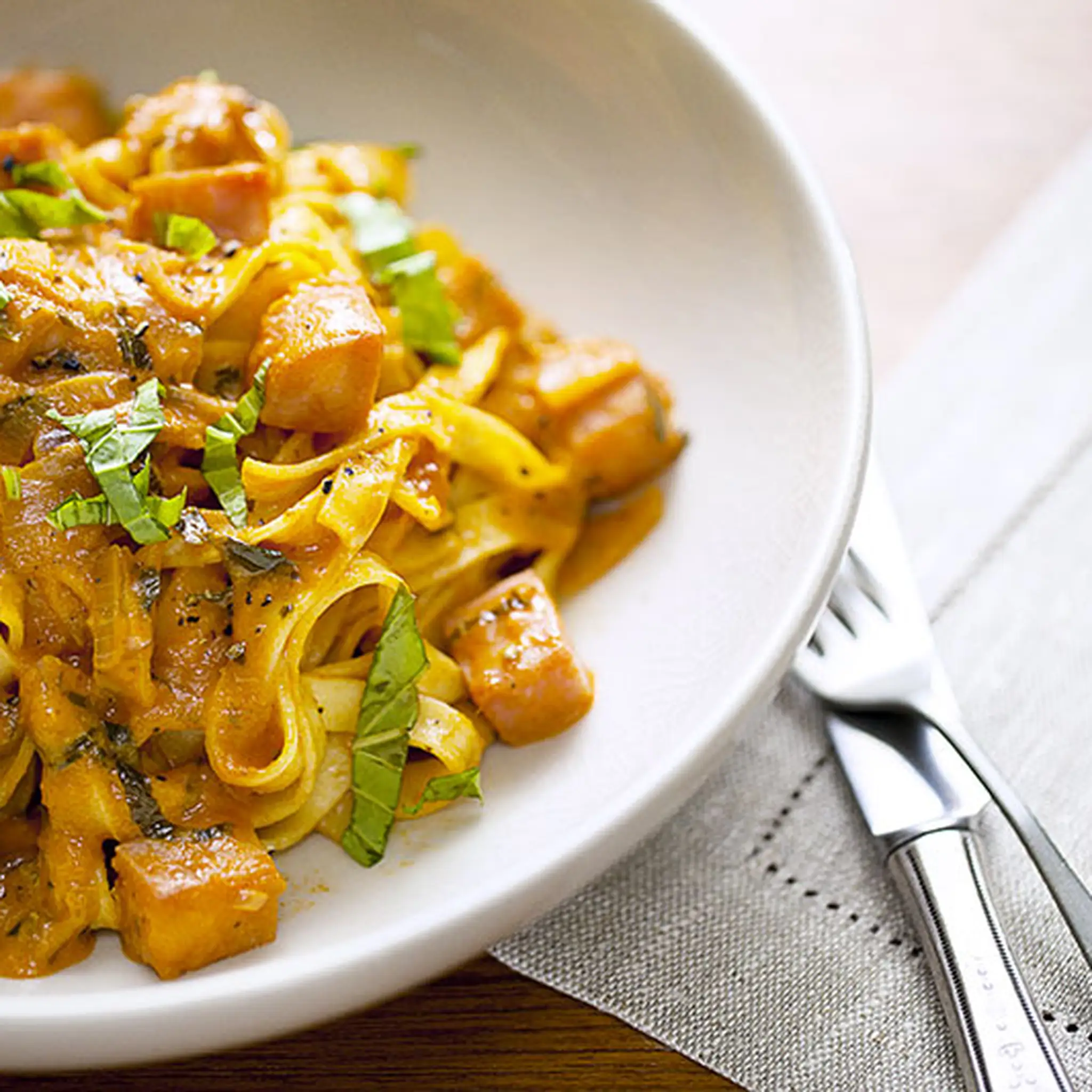 Ham fettuccini with shallot confit and rosée sauce flambée