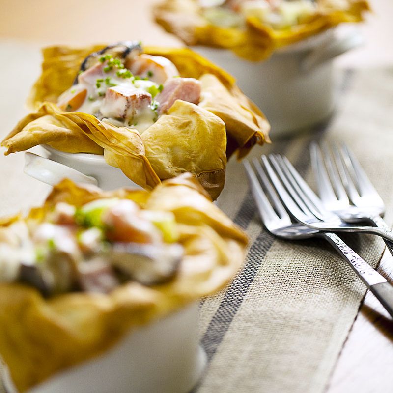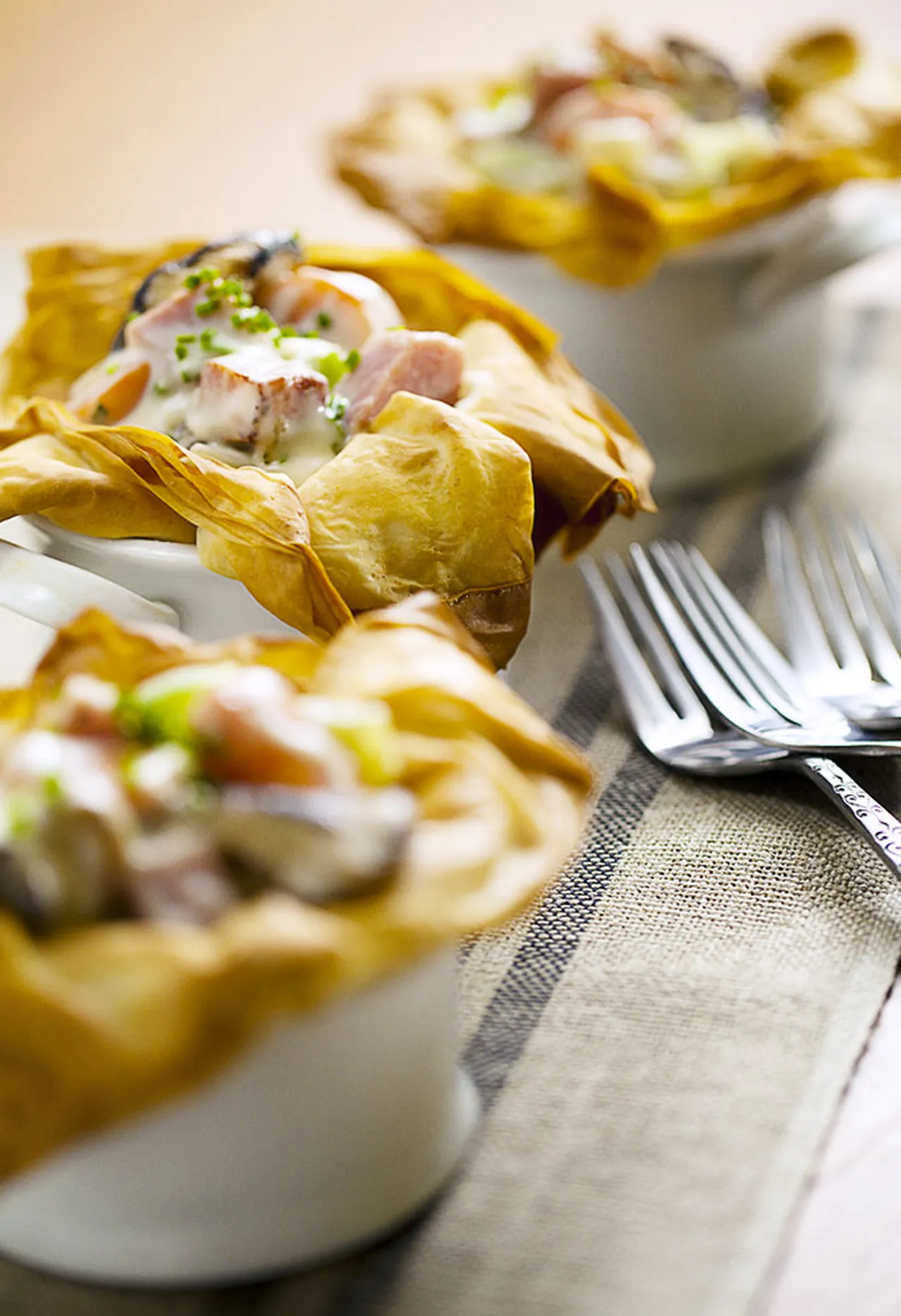 Phyllo Nests with Ham and Vegetables in Bechamel Sauce