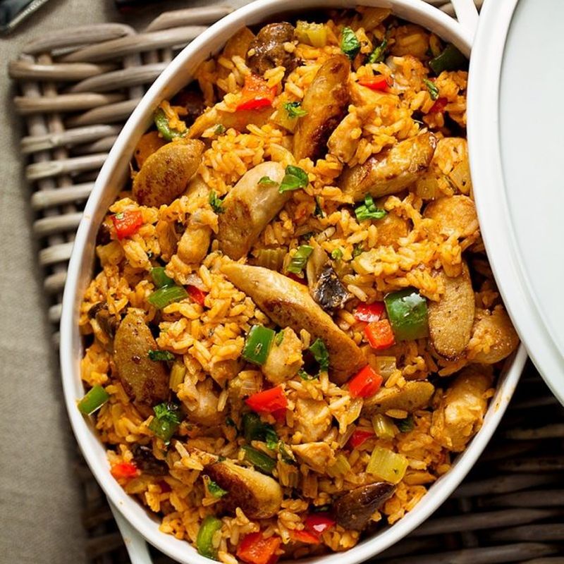 Tomato rice casserole with sausages, vegetables and fresh herbs