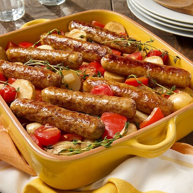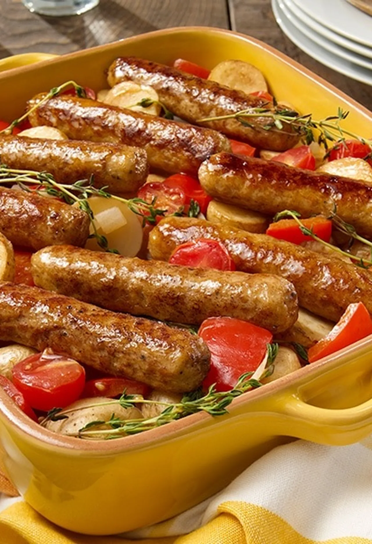 Place sausages on top of vegetables, cover with aluminium paper and cook in oven for 45 minutes. Take out of oven, turn sausages and cook uncovered for 15 minutes or until sausages are completely browned.